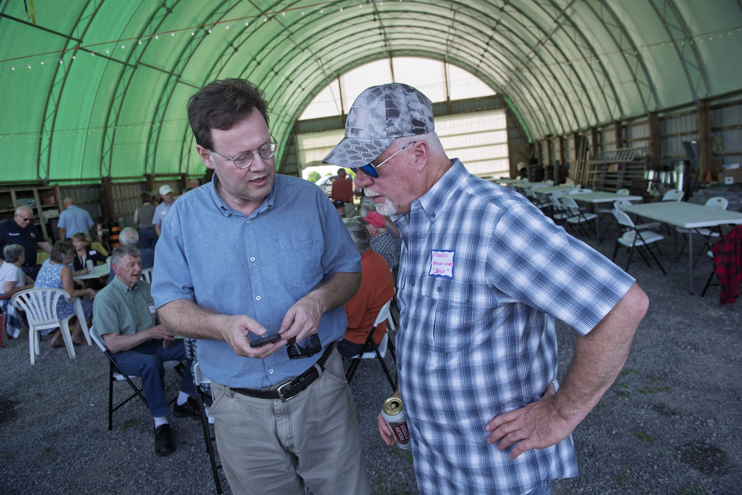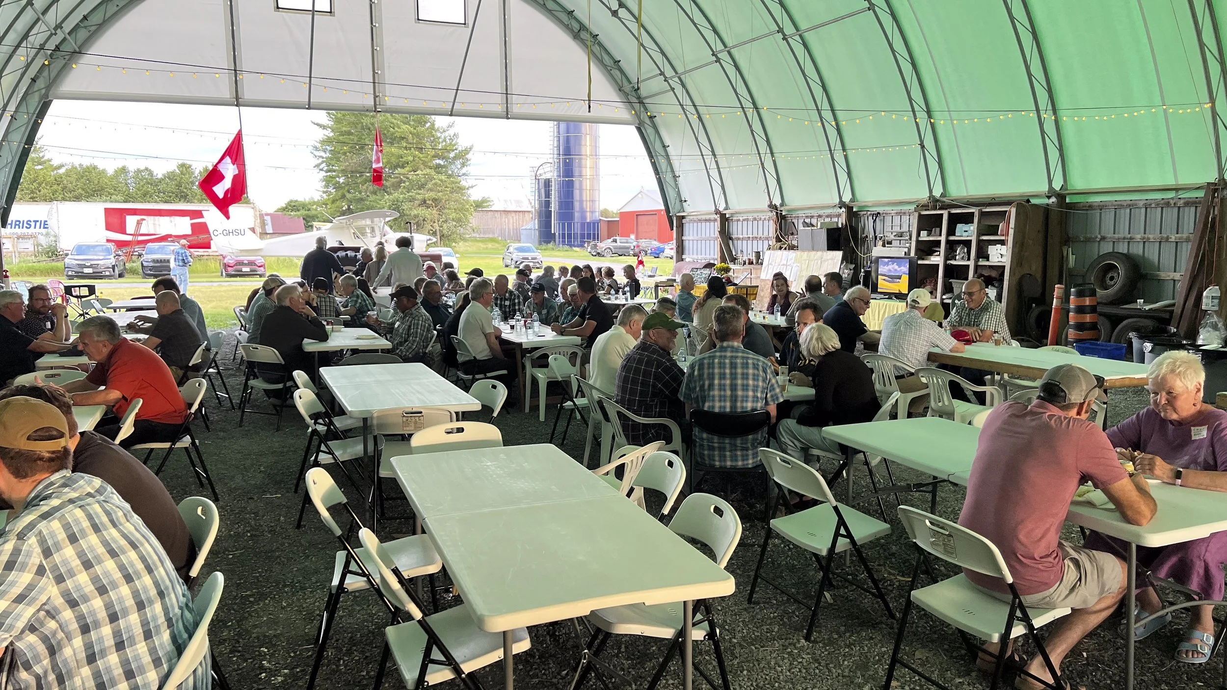 Kevin Psutka, former President of the Canadian Owners and Pilots Association chats with LCol (Ret'd) Marc “CoCo” Ouellette, former CF-104 Starfighter and F-18 Hornet pilot and 441 Squadron Commander. Photo: Peter Handley